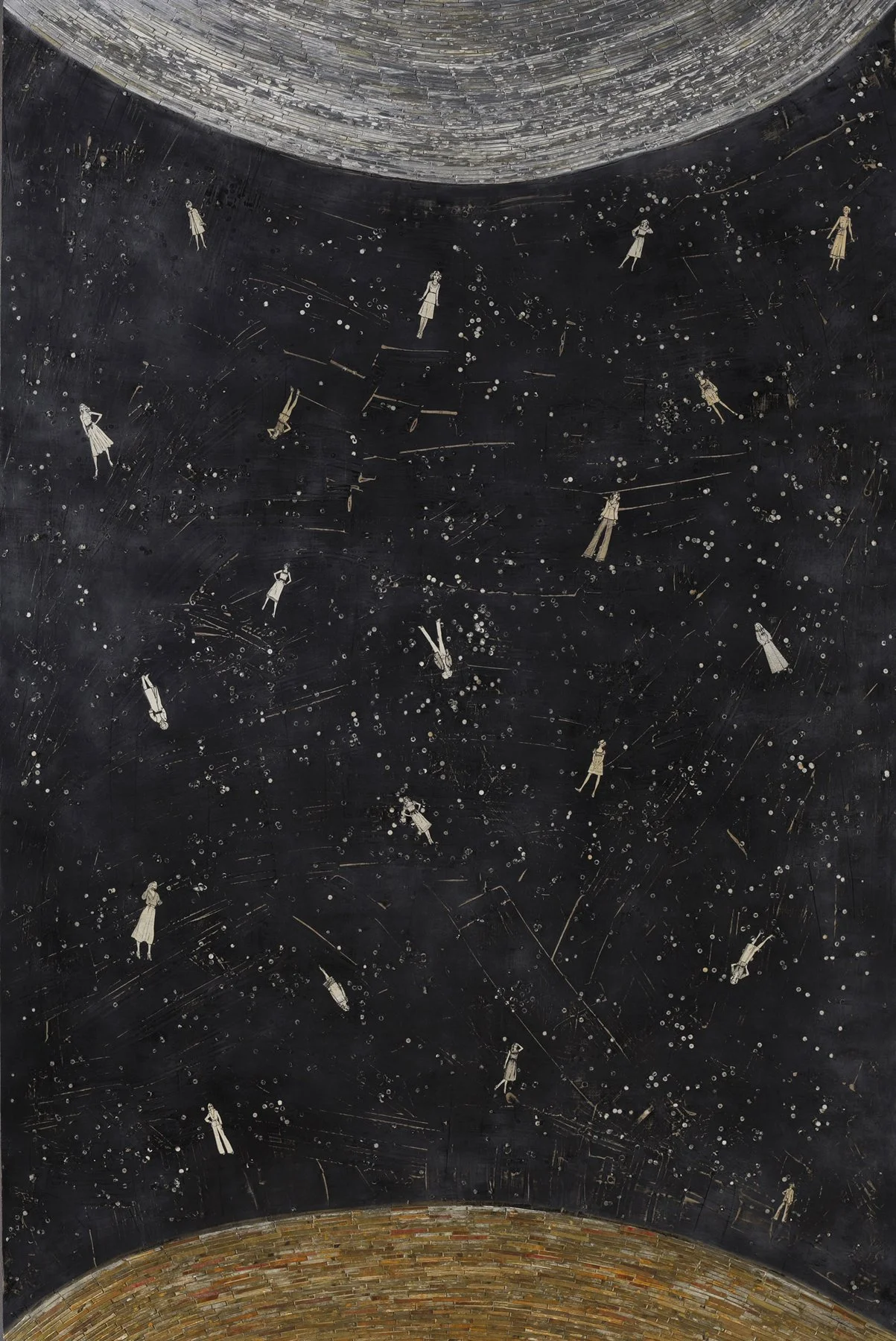 Astrogirls | 2009 | Sewing Paper cutouts, paper, oil on panel | 72 x 48" | Jordan Schnitzer Collection